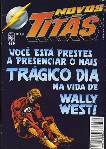Nos Estados Unidos, foi publicada em 1993 no gibi The Flash 76, uma das primeiras edições da aclamada e longeva fase do herói escrita pelo roteirista Mark Waid. No Brasil, saiu em fevereiro de 1996 como capa da edição 119 de Os Novos Titãs, série mensal da Editora Abril que tinha as HQs do Velocista Escarlate como atração secundária. Eu não colecionava Os Novos Titãs e conseguia ignorar quase todas as edições em minhas garimpadas nos sebos, exceto essa. A capa do cabisbaixo Wally West, o Flash, tirava-me de meu transe e me obrigava a parar nela. Por ter se tornado “parada obrigatória”, a capa acabou me marcando.