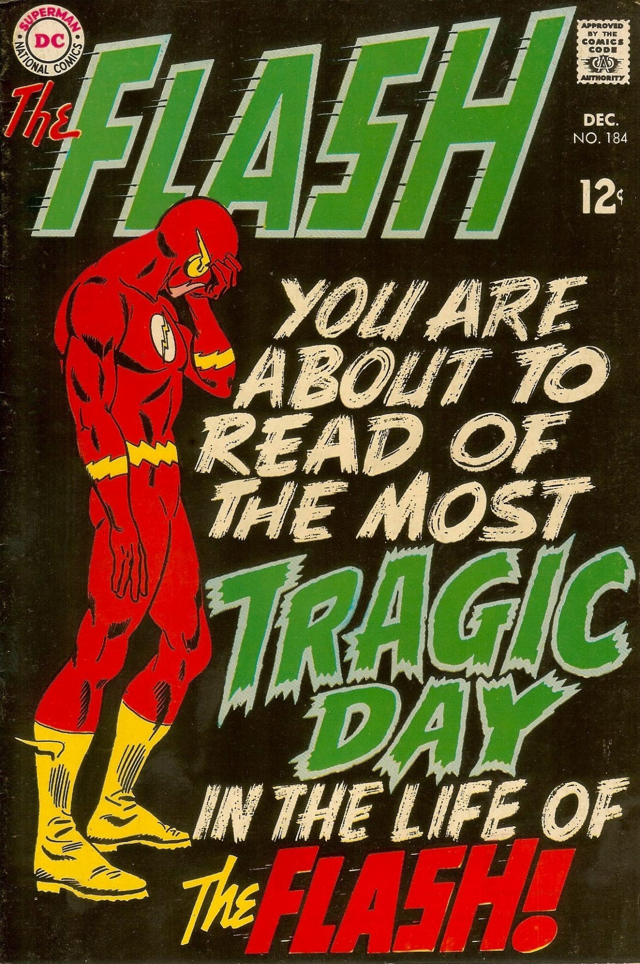 O curioso é que a capa remete a um gibi da série anterior do Velocista Escarlate, também nomeada The Flash e publicada de 1959 a 1985. Assim como aquela que lhe renderia homenagem 25 anos depois, a capa de The Flash 184, de 1968, desenhada por Mike Esposito, também mostra uma versão atormentada do herói, que naquela época era encarnado por Barry Allen. Atrás dele, um fundo escuro, e ao lado do personagem, ocupando mais da metade do espaço da capa, o texto: “Você está prestes a ler o mais trágico dia na vida do Flash!” (“You are about to read of the most tragic day in the life of the Flash!).