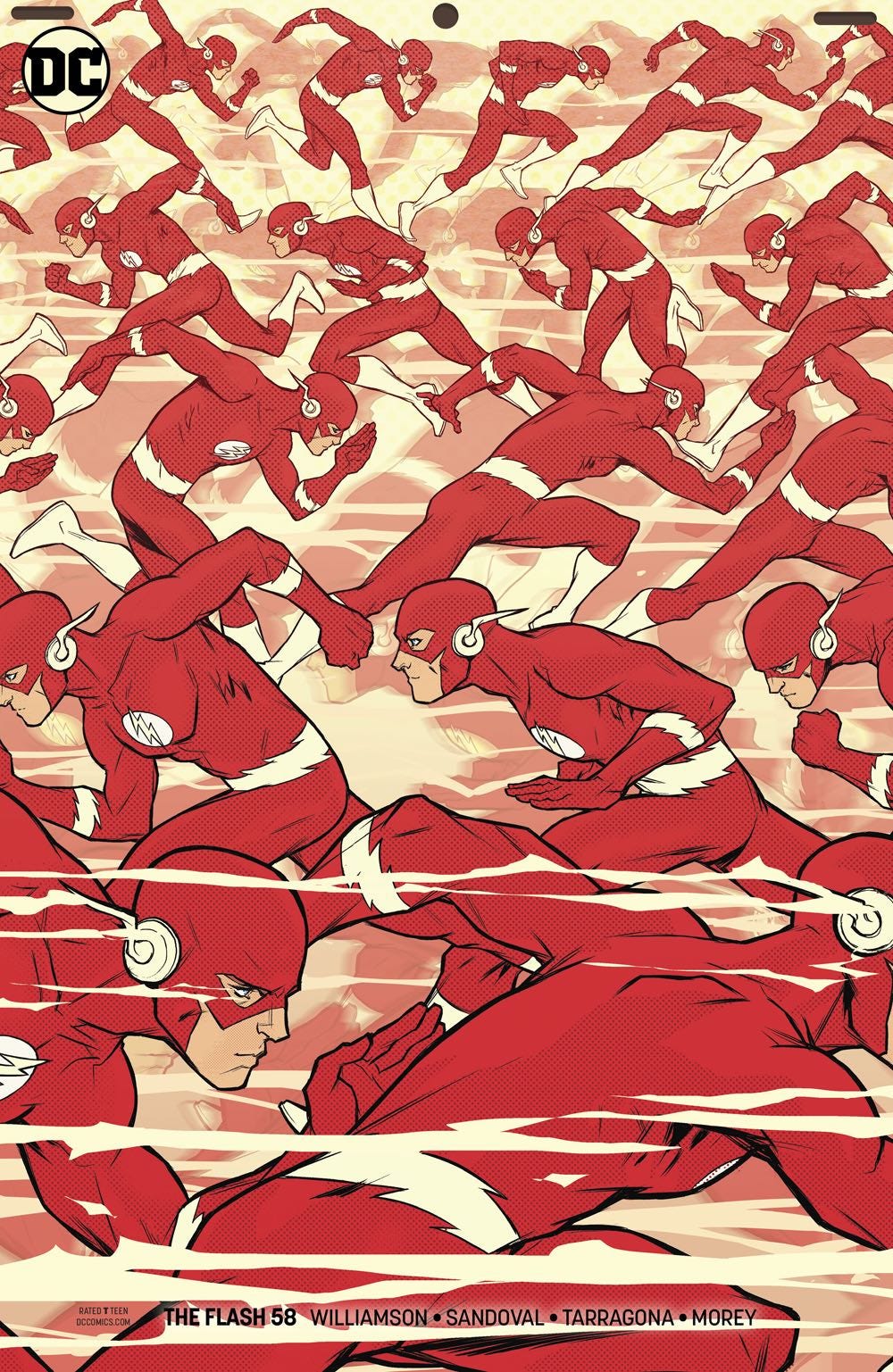 Como você leu no texto principal dessa edição, os membros do grupo sugeriram imagens e votaram na enquete “Qual capa do gibi do Flash melhor representa a supervelocidade do herói?” O questionamento rendeu muito papo e fez surgir muitas imagens maravilhosas do Velocista Escarlate, mas para nosso grupo, a que melhor transmite a ideia de supervelocidade do herói é a capa variante de The Flash 58 (2019), desenhada por Karl Kerschl.