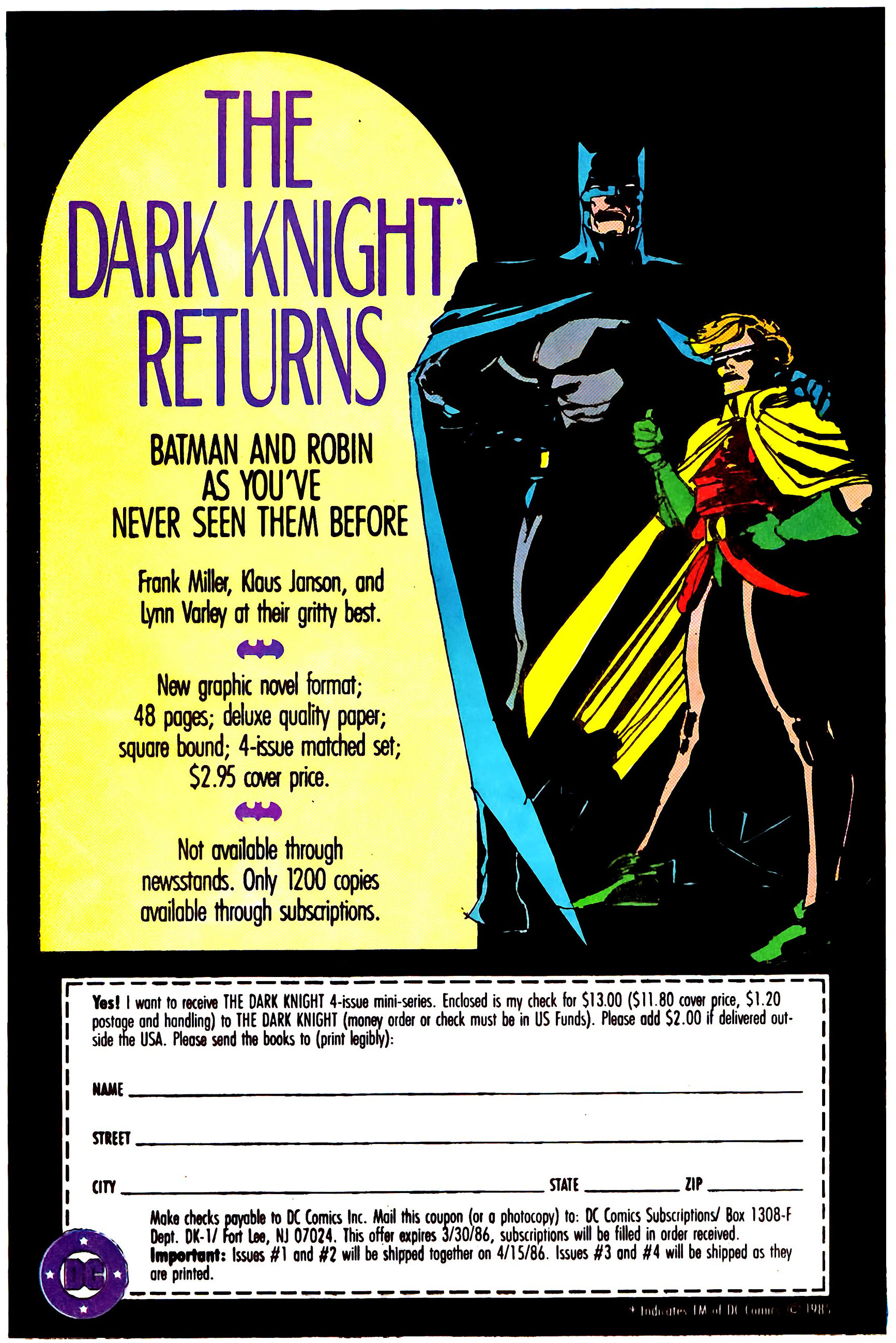 Esta foi a edição 154 da newsletter SOC TUM POW. Como regra, a cada edição trago uma capa de mesmo número de algum gibi ou revista, mas dessa vez abro uma exceção. Para celebrar os quarenta anos de lançamento da minissérie Batman: O Cavaleiro das Trevas, de Frank Miller, cuja primeira das quatro edições chegou às bancas e lojas estadunidenses no fim de fevereiro de 1986, apresento um anúncio da então novidade. Esse foi publicado em janeiro daquele ano no gibi Secret Origin 2. O “reclame” prometia: “Batman e Robin como você nunca viu!” De fato. Um marco que continua moderno quatro décadas depois.