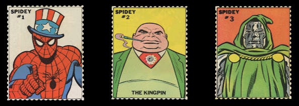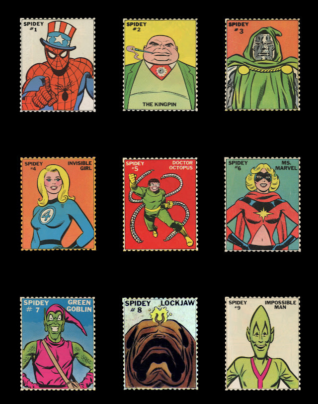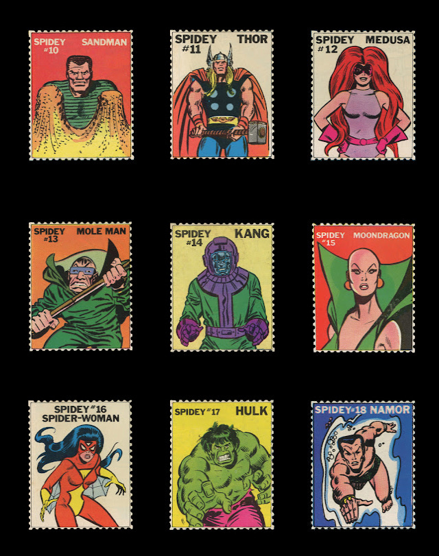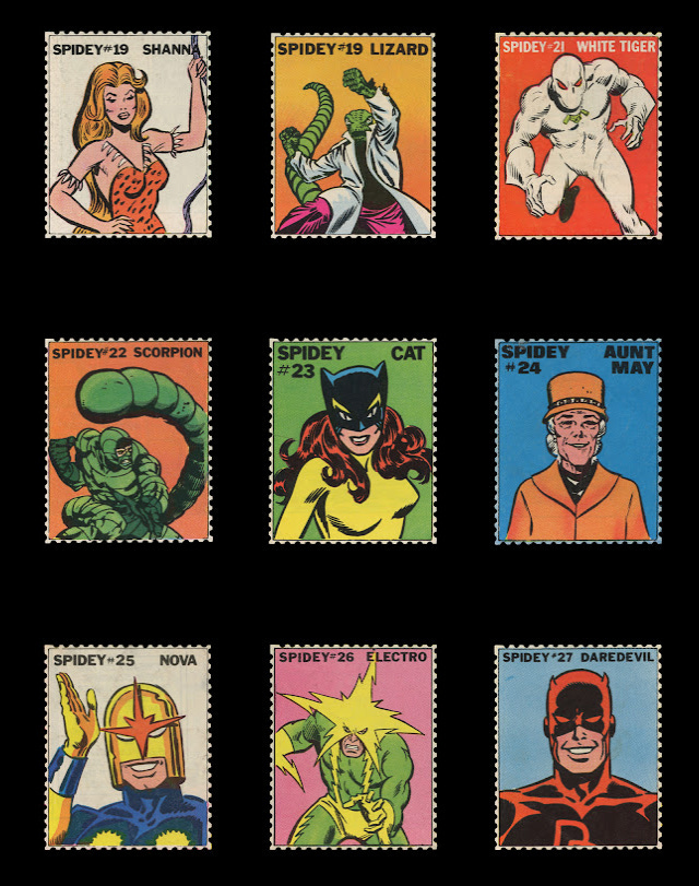 As edições seguintes traziam a ordem “Recorte e colecione: Spidey Stamps” e contavam com selos de algum personagem mostrado na trama principal da revista. A edição 18, por exemplo, trouxe o do Rei do Crime, criminoso enfrentado pelo herói naquele gibi; Spidey Super Stories 19 contou com um selo do vilão do mês, o Doutor Destino; a edição 39, lançada em 1979, trouxe o selo da Felina, heroína que uniu forças ao Aranha para enfrentar Thanos (na história em que o tirânico alienígena é mostrado pilotando seu famigerado helicóptero amarelo customizado). Até mesmo os vilões galhofeiros criados para a TV, como The Ringer e Human Top, tiveram seus rostos estampados.