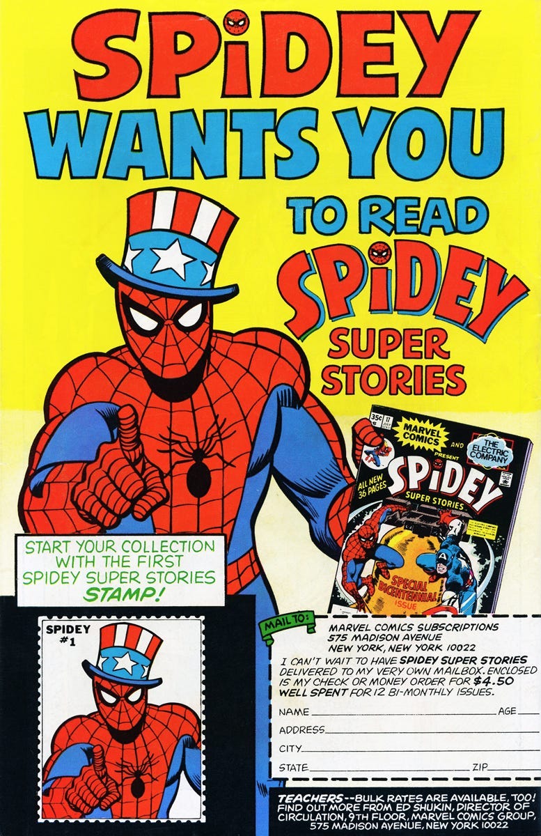 Em meado dos anos 1970, o Aranha era conhecido não apenas por universitários e adolescentes, mas também pelas crianças graças à estreia do herói em The Electric Company, um programa infantil que vinha sendo exibido desde 1971. De cunho educativo e com muito humor, a atração televisiva era voltada à audiência de sete a dez anos e marcada por esquetes de humor que ajudavam crianças a aprender a ler. O Aranha passou a fazer parte do elenco em 1974 como protagonista do quadro Spidey Super Stories (algo como Super-Histórias do Aranha), em que uma versão live-action do herói encarava criminosos absurdos em situações estapafúrdias. A Marvel aproveitou a popularidade do programa e lançou a série em quadrinhos Spidey Super Stories.