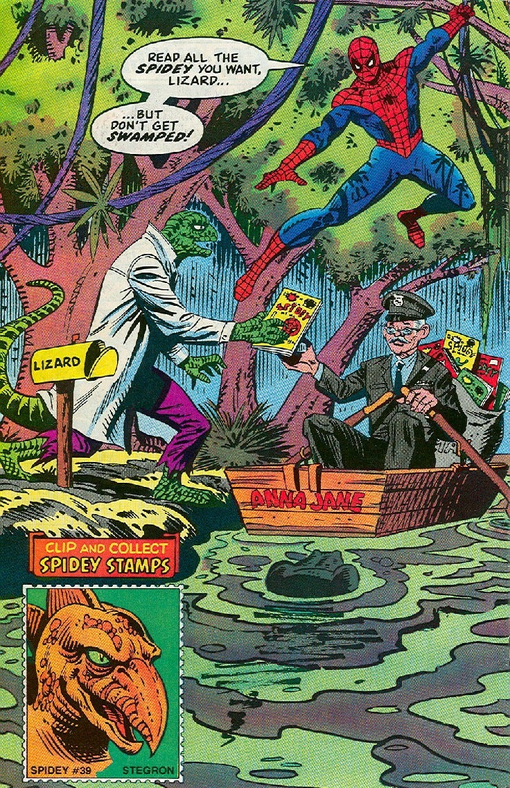 A coleção Spidey Stamps contou com 39 selos e foi finalizada em 1981, quando o último (com o rosto do vilão reptiliano Stegron) foi lançado em Spidey Super Stories 55. Alguns meses depois, o título seria cancelado na edição 57, que trazia a data de março de 1982 na capa, e para a tristeza de crianças e marmanjos, nenhum selo na quarta capa.